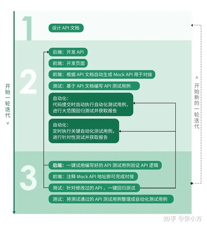 这套经营理念历经大量用户验证,逐步形成了以下的API研制测试流程,将后端、前端、测试等项目组更好地结合在了一起。