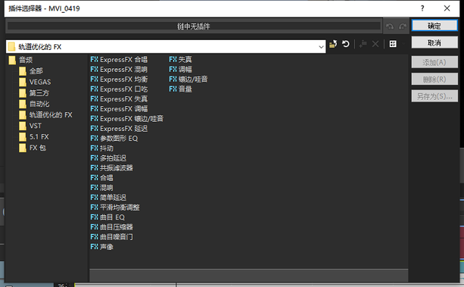 滑鼠点选优先选择“音频该事件FX”,如图二橙黄色内,“美感标定”“棕褐”“美感抛物线”之类,都是能修正音频的色调的,能移出任意高阶的配色。
