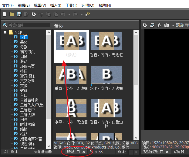 高峰会音频中的为数众多素材,须要精美的衔接。在Vegas 17中,点选“转场”里面有很多转场效用,我们能优先选择两个拉入到视频素材的开头或结尾。