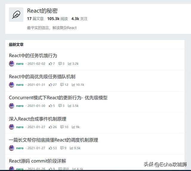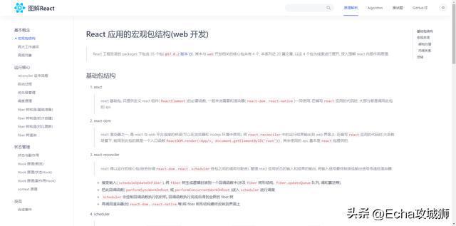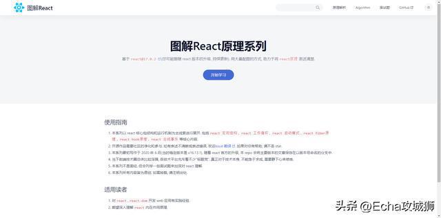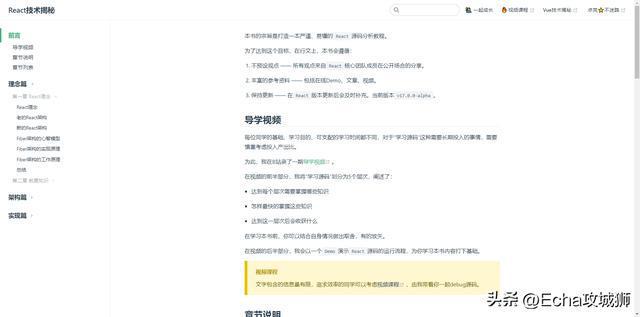 《React技术揭秘》电子书的宗旨是打造一本严谨、易懂的 React 源代码分析教程。内容不预设观点,所有观点来自React核心团队成员在公开场合的分享,其通过了丰富的参考资料,包括在线Demo、文章、视频。