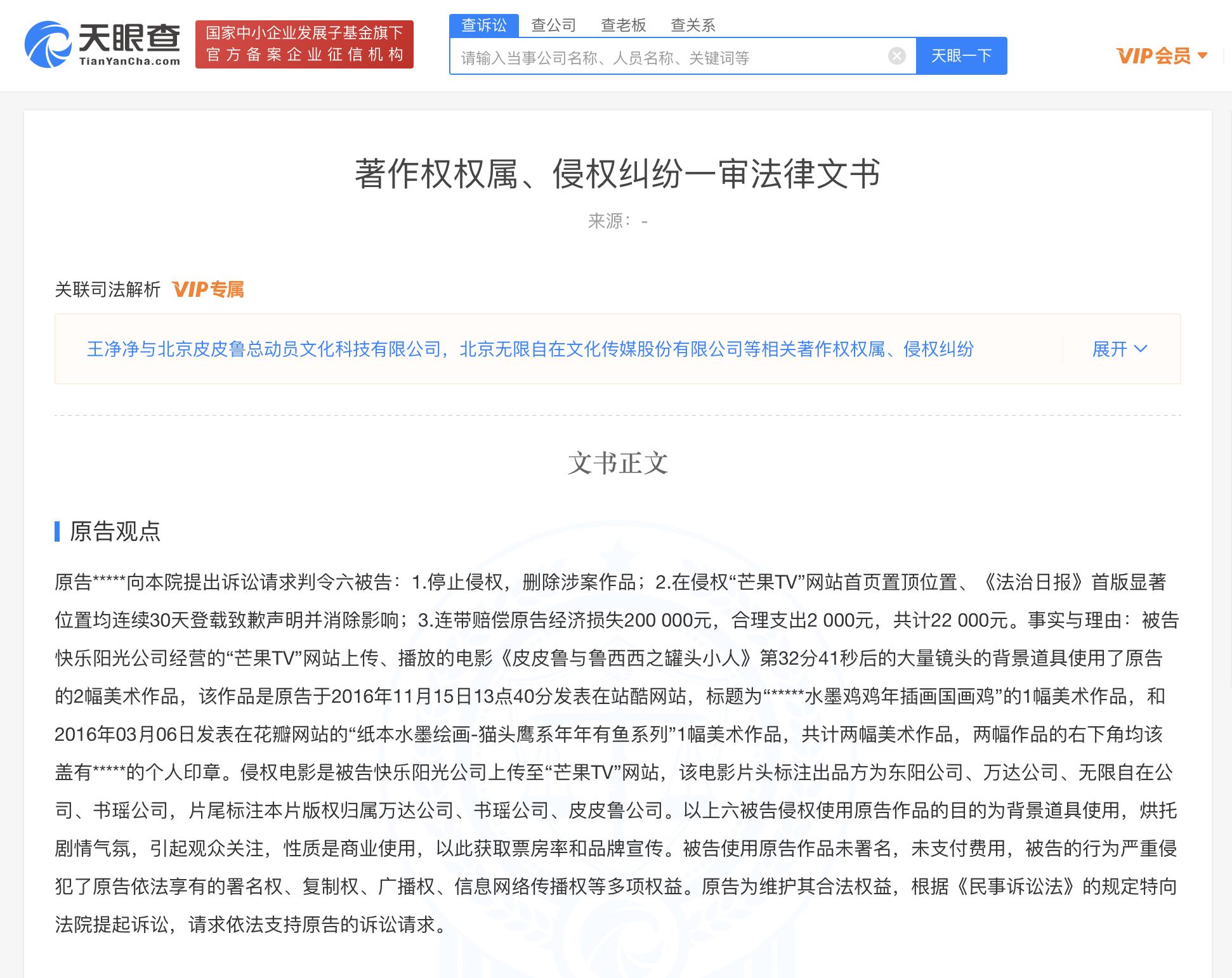公文表明,原告王某时供称,影片《郑渊洁与鲁西西之花生无赖》第32分41秒后的大批摄影机的大背景人偶采用了原告刊登在中文网站上的2幅美术经典作品,一幅经典作品的左下角均该盖有王某时的对个人公章,原告郑渊洁子公司等采用原告经典作品未代笔,未缴付服务费,轻微侵害了原告的肖像权、拷贝权等数项合法权益,故维持原判高等法院,允诺高等法院维持原判原告暂停侵权行为并索赔原告损失服务费等。