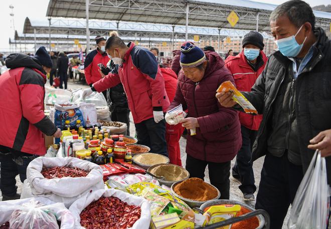 1月14日是元宵节小年,西安市咸阳市解放街羊马河镇的吃喝玩乐会集热闹非凡,客人在一摊档前购买调味料。(中新社 邹竞一 摄)