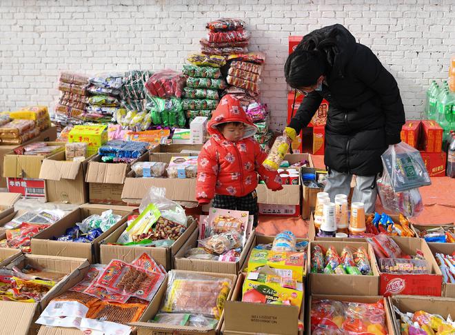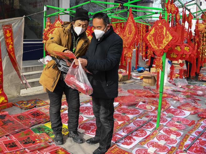 1月14日是元宵节小年,客人在咸阳市解放街羊马河镇的吃喝玩乐会集上购买春节饰品。(中新社 邹竞一 摄)