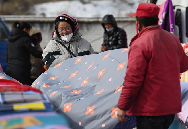 1月14日是元宵节小年,客人在咸阳市解放街羊马河镇的吃喝玩乐会集上购买布料。(中新社 邹竞一 摄)