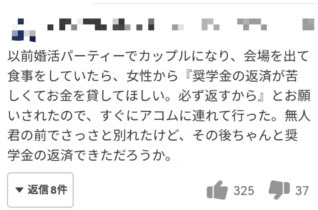 以前在相亲派对上遇到了一个女生,一起去吃饭的时候,女生说,还献爱心贷款太难了,能借我钱吗,然后就带着女生去了acom的贷款机构借钱,然后在那儿的自动契约机前分开了,之后女孩应该还贷款了吧。