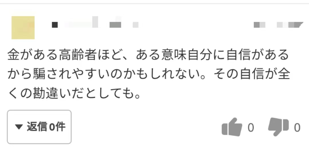 站在“妈妈”方的立场来看,即使受到伤害,也无法公开。这样的人好像很多,这也许只是冰山一角。看到这个新闻的时候,脑子里浮现的是木村佳乃的一步TBS《侄儿业》,虽然不完全一样,但是内核都是另一方为的是钱,另一方为的是“爱”,老人如何度过孤寂的晚年生活十分关键。虽然看起来好像双方相互竞争没有什么不妥,但是20余岁的女生,又接受过正规的教育,却只想着通过这样的方式换取钱财……对此你怎么看呢?