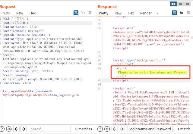 透过抓包他们可以发现,如果公钥不正确,响应包会出现Please enter valid LoginName and Password,他们可以以此为依据判断暴破是否赢得成功。