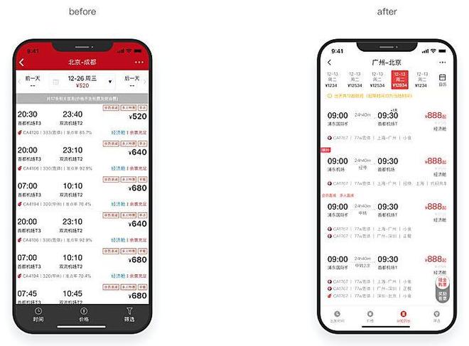 通过强化页面重要信息层级,对页面重要信息展开分类重组,使乘客能快速找到重要的重要信息,提高页面阅读效率。例如:日历展示近4天的最低票价,方便使用者快速对比;航班列表减少重要信息层级,时间、价格重要重要信息一目了然。