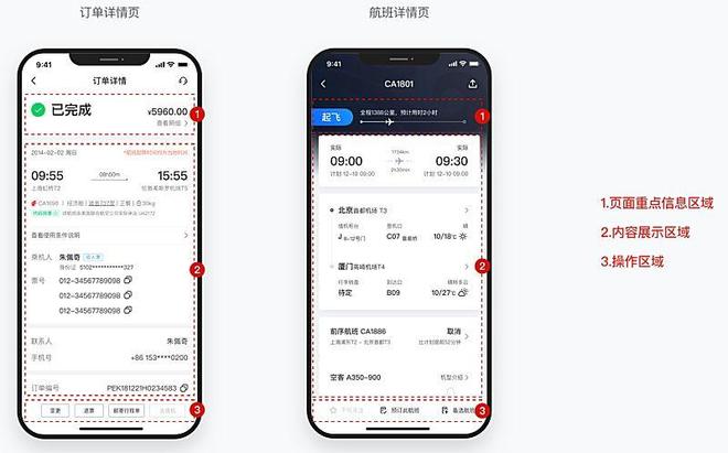 页面结构的变化会让使用者思考,而规则的排序能有效减轻使用者的记忆负担。例如:订单页和航班详情页,页面上方显示关键重要信息,中间为内容显示区域,最下方为固定页面询问的操作区域,使用者可以快速找到所需重要信息。