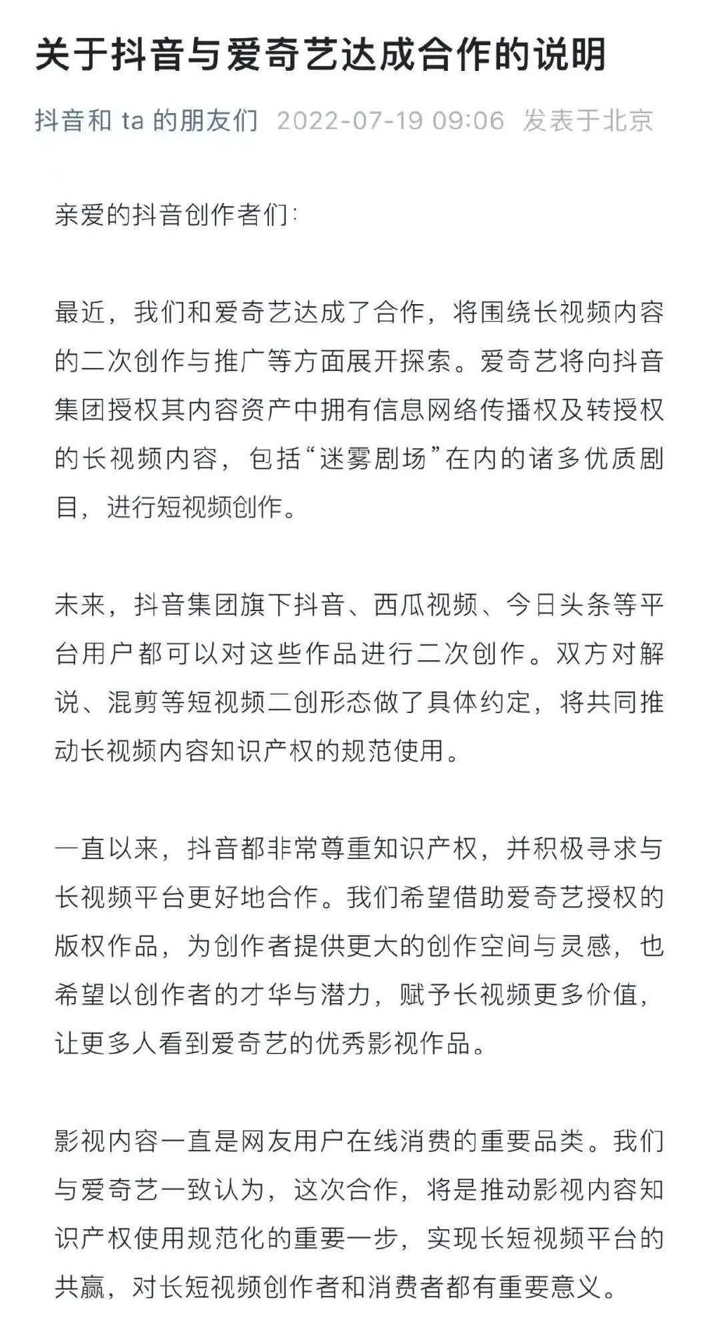 抖音和爱网易宣布达成一致合作,积极探索二创。