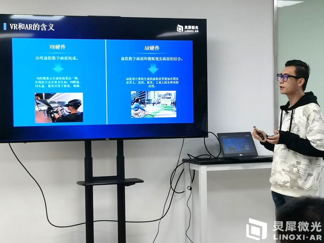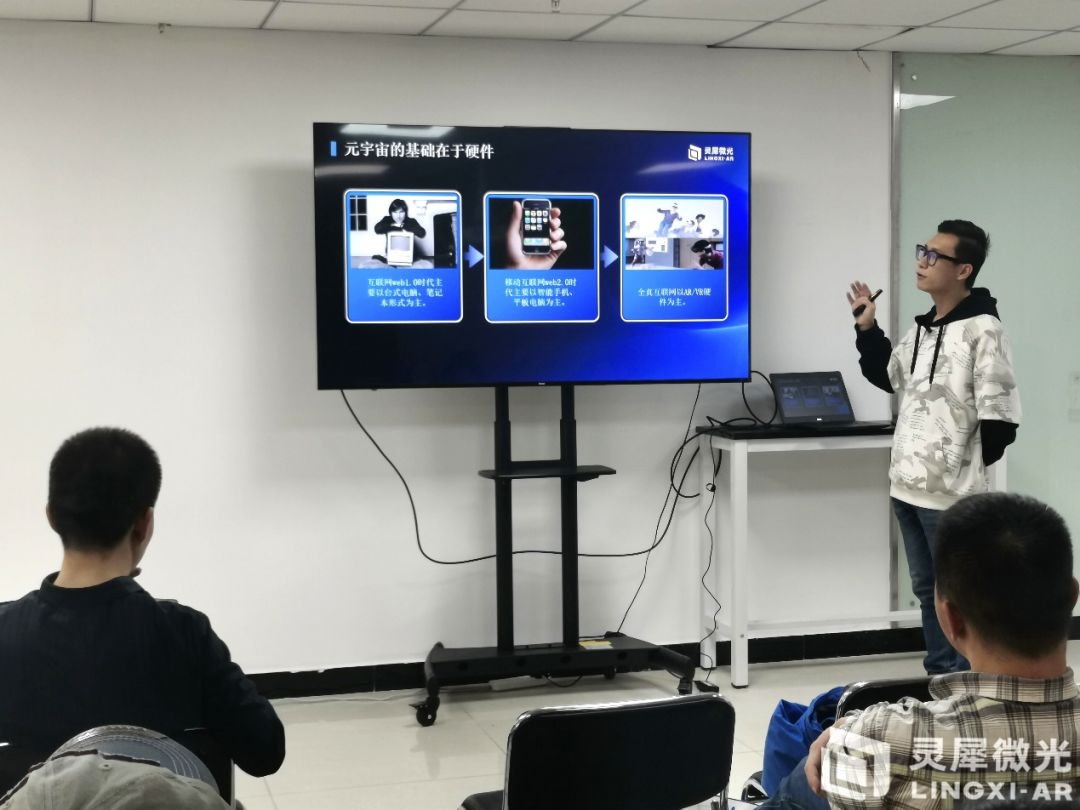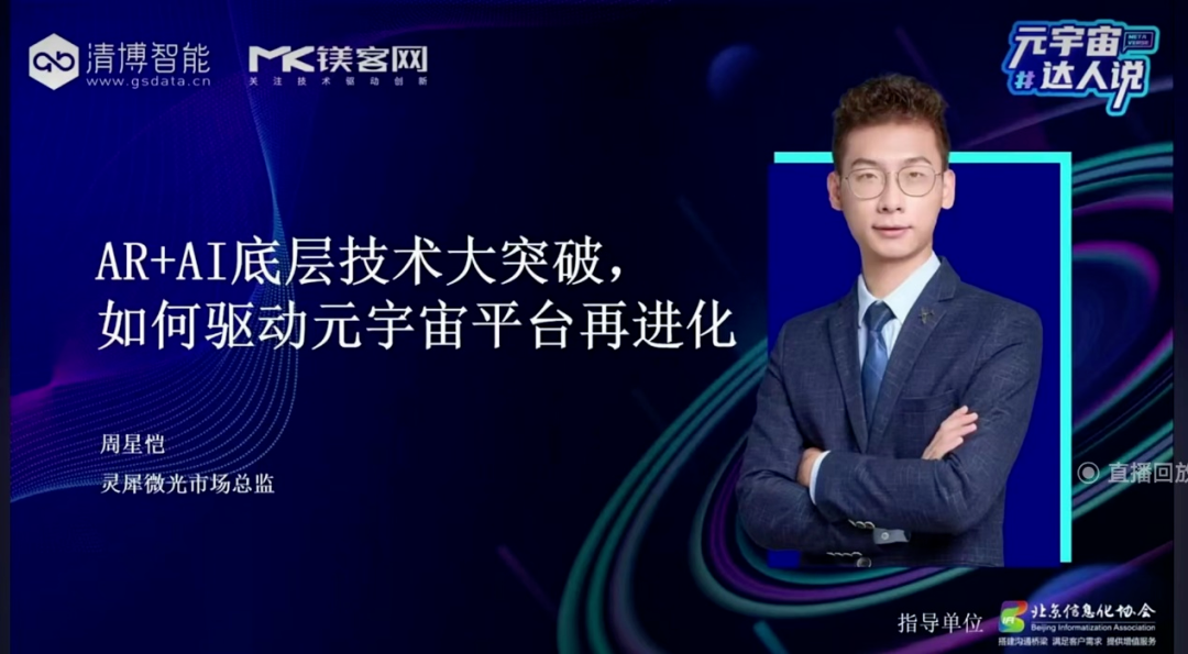 图 | 演说当晚“AR终端产品的产业发展向着极致超薄、便携和高性能的路径,其具备较强的场景适应性,适合随身携带,定位与今天的移动终端产品(手机)如出一格。因此,AR终端产品正向着眼镜的路线快速产业发展,其中核心控制技术在于AR光学的突破。”周星恺分析道。