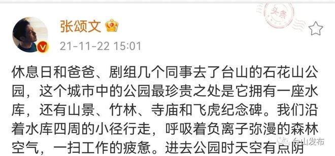 2021年底,主演张颂文在台山拍摄期间,常在微博上“碎碎念”,随手拍美景,与网民们分享五邑趣闻。金山火蒜、端芬翁家楼、石花山公园、梅家大院等都是他的分享素材。