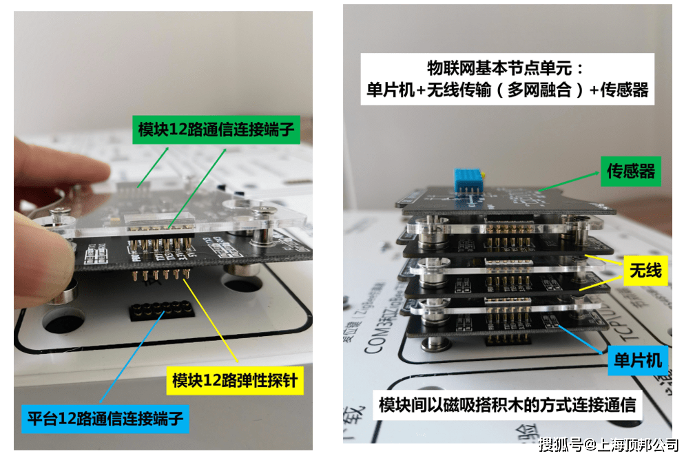 8、组件均选用磁吸式USB结构设计+搭积木式结构,集成标准的 12 路弹性插针,能实现供电控制系统、仿真调试、统计数据通信、IO 口开拓等功能,同时支持搭积木式的多级磁吸联接,通过弹性插针方可通信,无须外接跳线, 通过组件相互搭积木,组成一套完整的物联网控制系统,如:STM32 处理器+ZigBee 有线组件+感应器组件(3 层垂直积木,无须额外相连线),可开拓科灰藓,如下图所示: