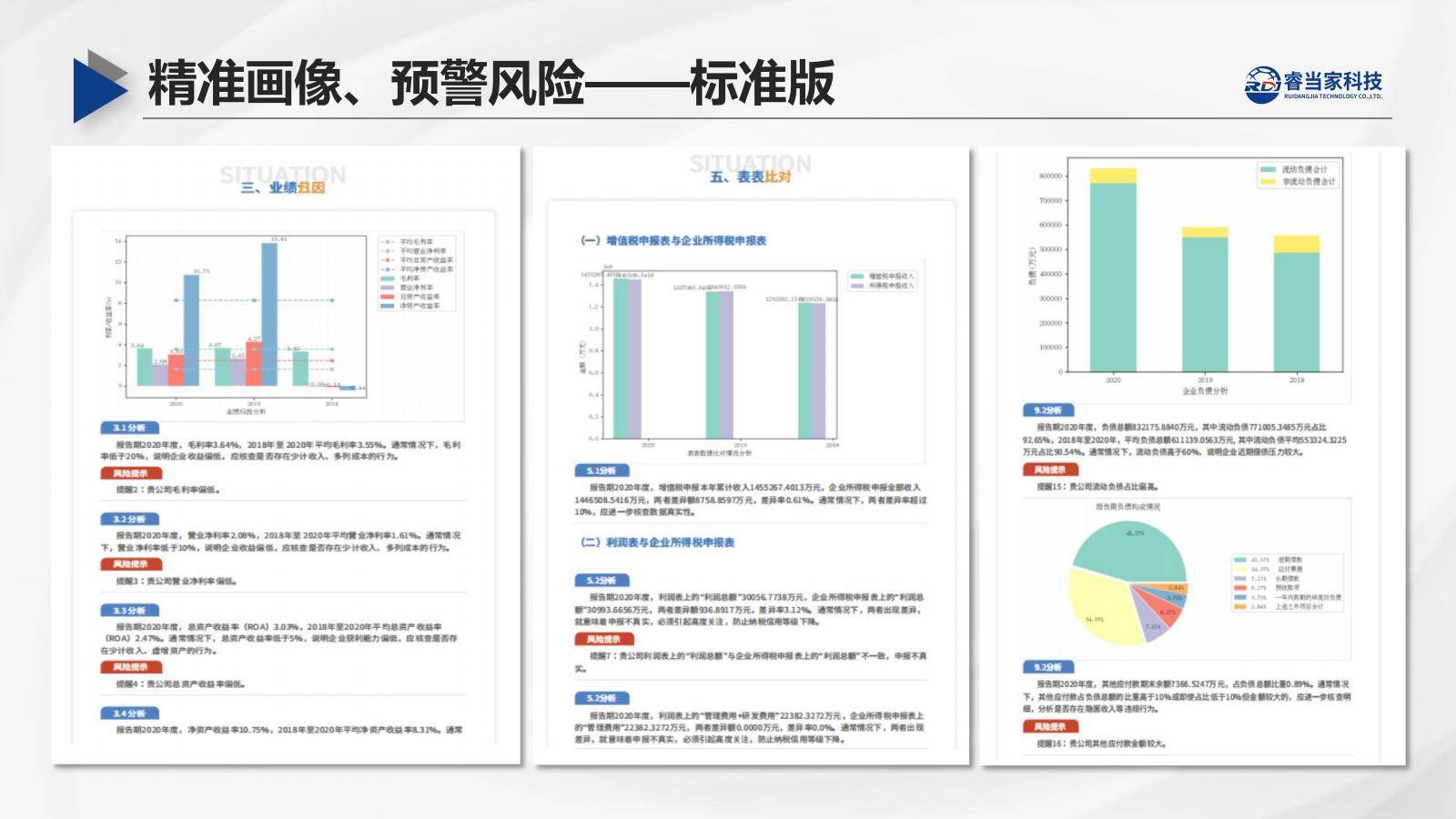 睿当家险易梳针对如今民营企业面对税赋时“商业商业模式不合理税赋偏高”、“税赋不介绍多缴冤枉税”、“金四大数据监管时代违规信用风险高”、“发票开具或接受不规范,承担违规信用风险”,以及税赋干部工作时面对的“多维立体的征管信息”、“多样化的会计核算”、“海量数据”、“疑点成因不清晰”等难题,睿当家“险易梳”能一键检测、加速出具报告、可视化呈现、信用风险提示、数据安全保护、权威设计.