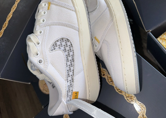 整身采用了大面积白色帆布覆盖,搭配上原配的棕色的Swoosh,Union的招牌标签”UN/LA”继续保留下来,这也是双方密切合作的老传统了。