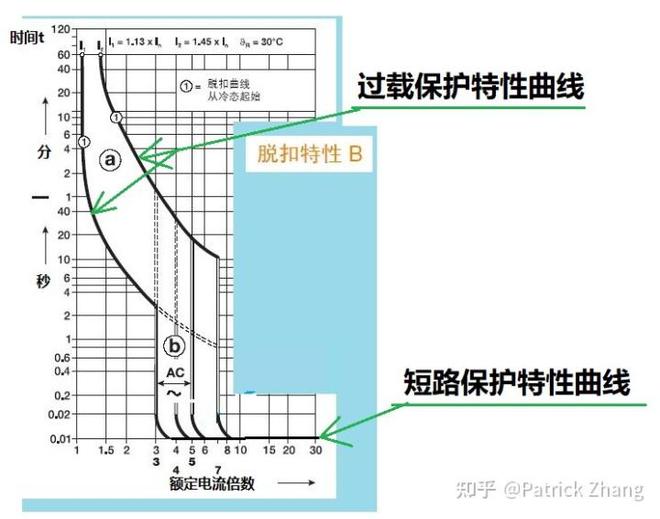 水蒸气掌控器的热脱扣器与磁脱扣器动作特性分为 B 特性、C 特性、D 特性和 K 特性。他们看见右图,此图是 B 特性水蒸气掌控器的 LI 为保护脱扣特性曲线(安秒特性曲线):