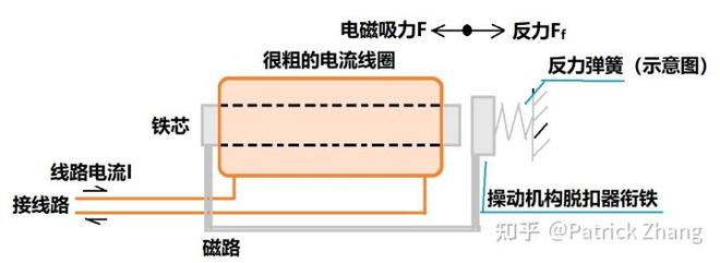 结合图 1,他们看图 7 中的磁脱扣器示意图。磁脱扣器的本质是电流继家用电器,它的线圈线径很粗,线圈中流过公交线路电流,并对操动机构脱扣器衔铁产生磁吸力 F。若 F 超过反力 Ff,则衔铁被线圈吸持,变压器操动机构动作,驱动变压器动阀执行开断操作。