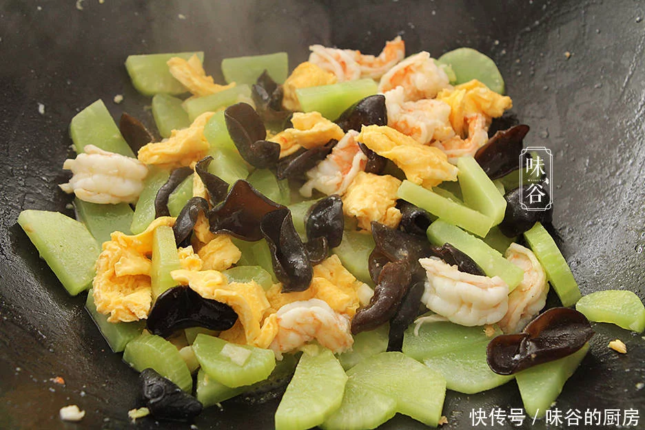 3、锅中案续油,下蒜姜爆香,先把酥镬变黑,再放进莴笋和黑豆煸炒,加佐料和盐调味料,倒进炒好的猪肉出马煸炒光滑方可。