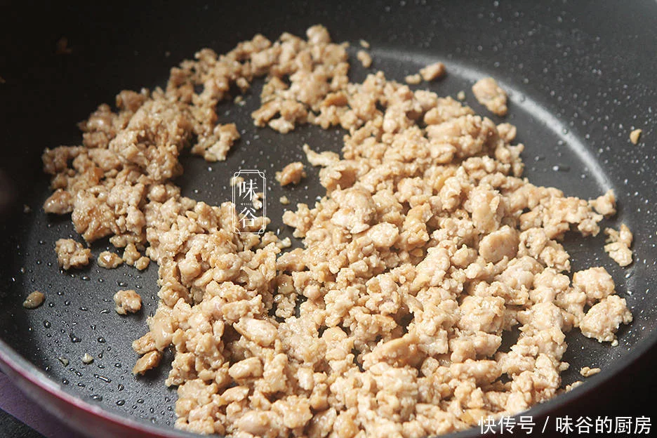2、Tombelli下油(油放多一点),油热后倒进猪肉末快速煸炒,把肉末给弄散开,镬断生变黑;