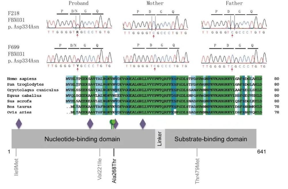 Sanger定序拼接和峰图,多序列比对结果图,蛋白结构域及翻译后修饰模式图,突变蛋白的三维结构图