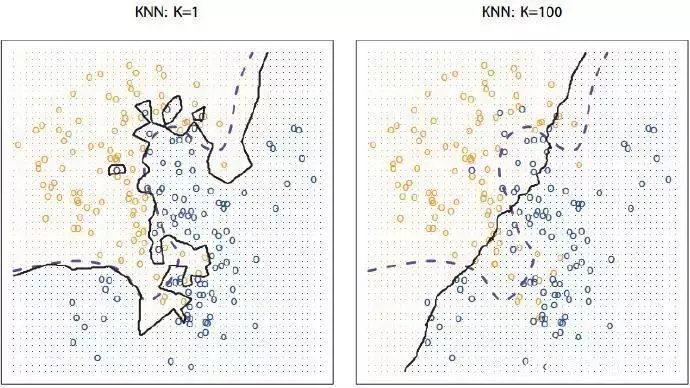 KNN的进行分类边界是非线性的,K越小越容易过拟合,我们看到到K = 1的时候,这个时候只会根据最近的单个点进行预测,如果最近的一个点是相反的噪点,这个时候就预测出错,这个时候无形之中增加了计算的复杂度,鲁棒稳健性比较差。但是如果K取得比较大(例如K = 100)的时候,这个时候又会欠拟合,数学模型计算非常单纯,并且进行分类的边界也会比较的平滑。