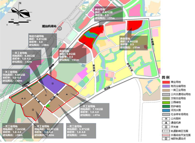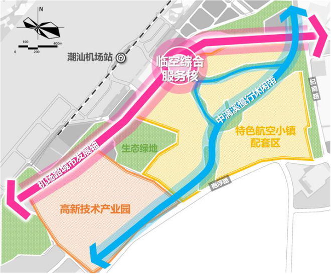 总体规划定位:依托肇庆汕头国际国际机场与肇庆国际机场高铁站,定位为空铁枢纽产业集聚区。西侧引入精密电子、集成电路、智能电器、航空物流等产业打造高新产业集聚的现代化产业园区,东侧主要引入商业配套、休闲娱乐、酒店及餐饮配套,打造临空综合服务核心,为国际机场、高铁和航空产业提供优质配套服务。