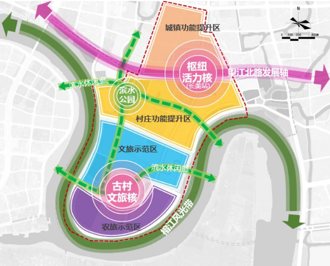 总体规划定位:依托长美城铁站建设,联动片区,定位为肇庆文旅新地标。充分挖掘肇庆古城、长美古村文化底蕴,利用榕江、水乡、古村等本底资源,打造肇庆特色文旅商业服务中心、开放共享活力街区。