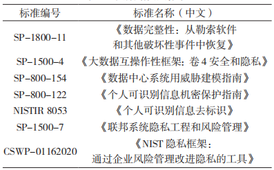 为 支 撑 大 数 据 建 设 发 展, 美 国 国 家 标 准 与技 术 研 究 院(National Institute of Standards andTechnology,NIST)于 2012 年启动了大数据相关标准研究,并于 2013 年成立了 NIST 大数据公共工作组(Big Data Public Working Group,NBG-PWG),对所有相关方开放,旨在通过结合行业、高校和政府等各方力量加速对大数据技术甚至大数据产业的接纳和应用。NIST 发布的大数据标准如表 1 所示。