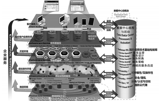 从图 3 可以看到,核心数据中心在图的中心,其围绕着传输网络与联合安全栈、各种网关相连。图的左侧是运行中心及态势感知分析云。核心数据中心由企业服务、统一能力、管理系统和非军事区等 5 个要素组成,是联合信息环境的核心。CDC 的顶层架构如图 4 所示。