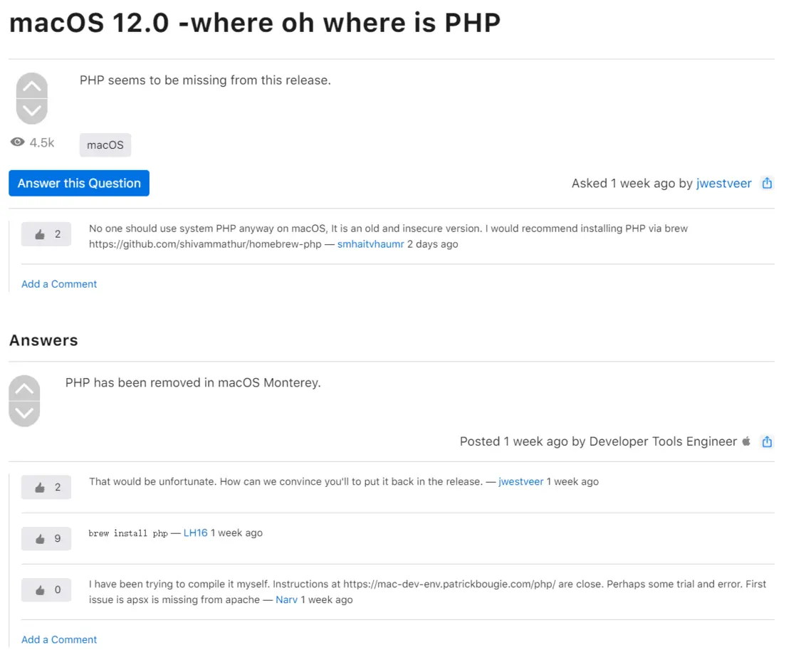 上方回帖的网民立场倒是意见分歧非常大,没人则表示这是两个非常大的退步,还没人则表示 macOS 便携式的 PHP 是落伍且不安全可靠的版,拿掉是恰当的优先选择。