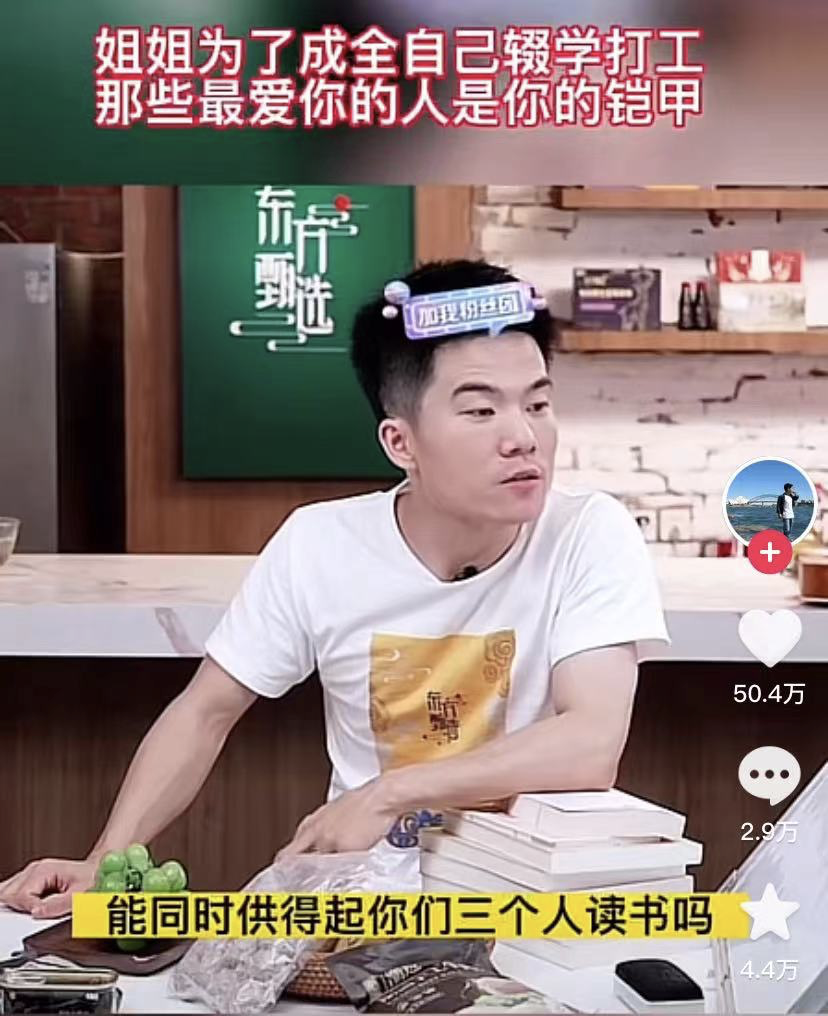 直到后来,妈妈才告诉董宇辉,“你以为姐姐是真的不想读书吗?你觉得我们家能同时供得起三个人读书吗?”
