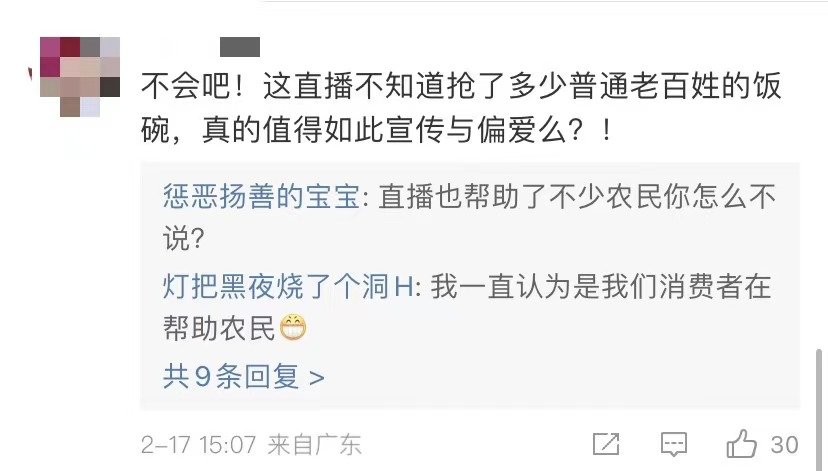 “这直播不晓得抢了多少普通老百姓的饭碗,真的值得如此宣传与偏爱么?!”