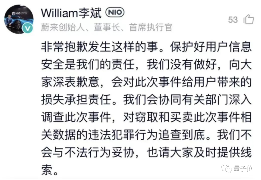 蔚来董事长李斌昨晚也在非官方街道社区就此事致歉,表示会对“此次事件给使用者带来的损失承担责任”,且“不会与不法行为妥协”。