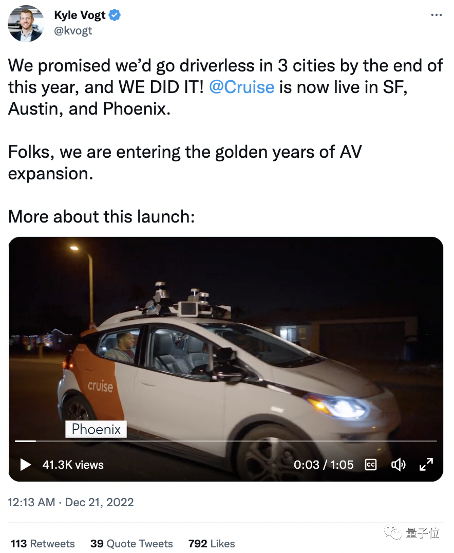 Cruise的CEO Kyle Vogt在twitter上分享了一段乘客们对其完全无人驾驶车辆赞不绝口的视频,他还表示“我们正在进入自动驾驶车辆扩张的黄金时期。”