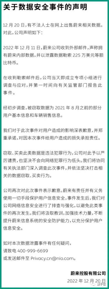 2022年12月11日,蔚来子公司接到外部电子邮件,宣称保有蔚来外部统计数据,并以外泄统计数据敲诈225亿美元(折合1570.5多万元港币)超额比特币。