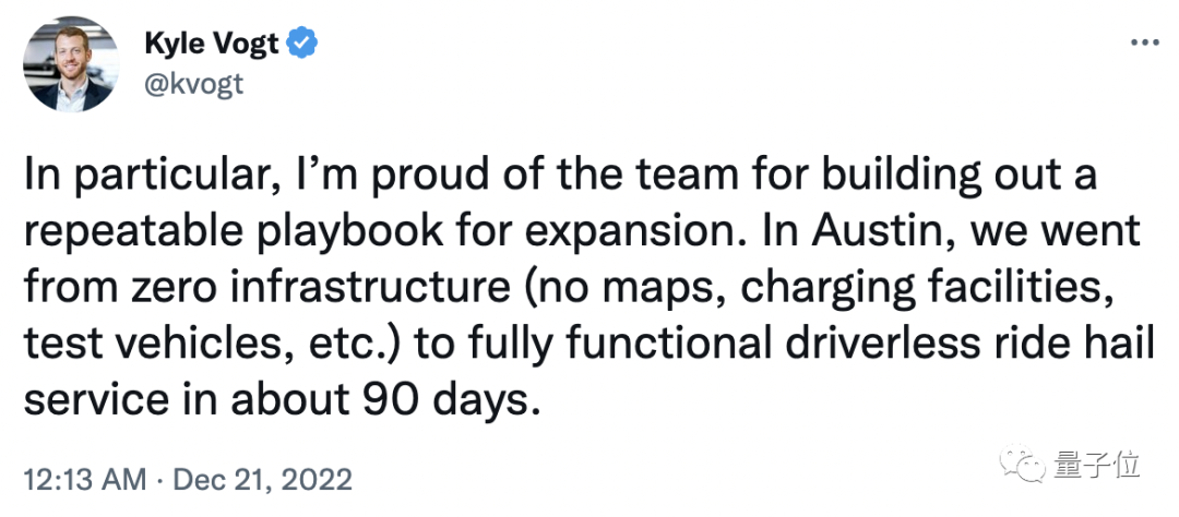 此前,Cruise只在旧金山运营其自动驾驶出租车服务。Vogt在twitter表示对项目组只用了90天,就在奥斯汀从零发展到全功能无人驾驶出租车服务感到骄傲。