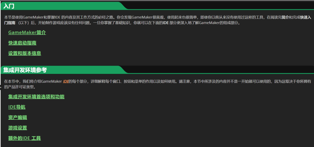 对于发动机的使用与学习,首先需要看的就是协助文档。GameMaker的文档内容属于保姆级别,看了就会,涵盖很多格斗游戏结构设计上的细节,只要肯按F1,看下示例代码,一般不会有什么太大的问题。但中文文档目前大体属于机翻,之前还有过很多搞笑的翻译,如把精灵翻译为雪碧等等,这需要长时间的打磨,亚洲地区已有LiarOnce同学进行了较为全面的翻译,GameMaker文档的早期中文版本就是GIT他的,确实翻译的很到位。不过,如果能够懂许多英文,对文档原意会有更深刻的理解。