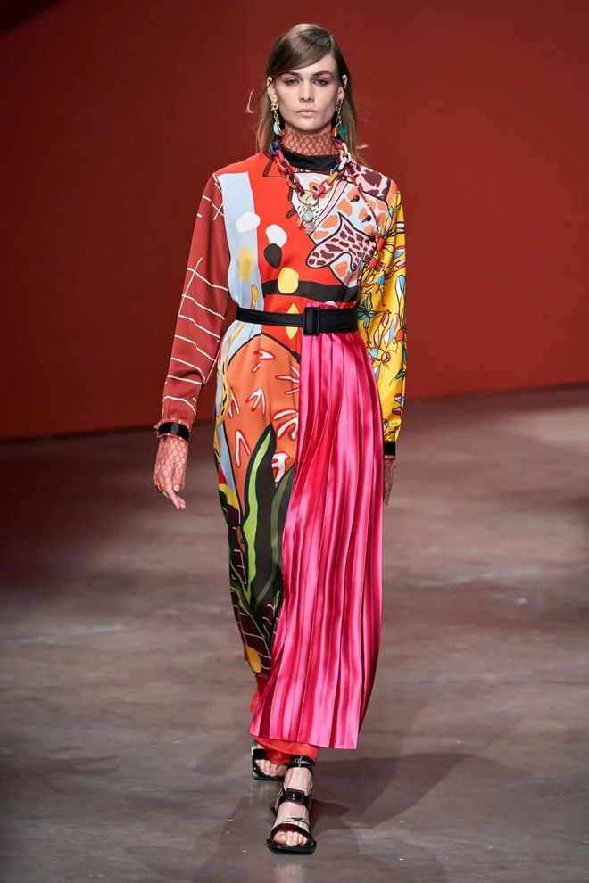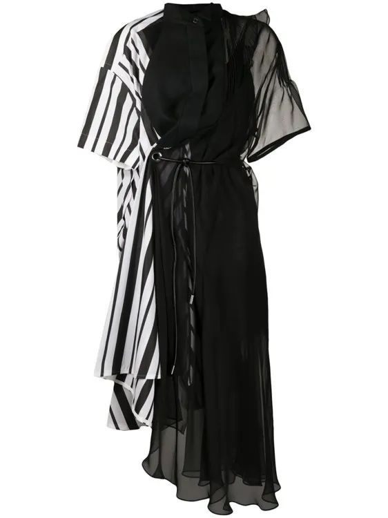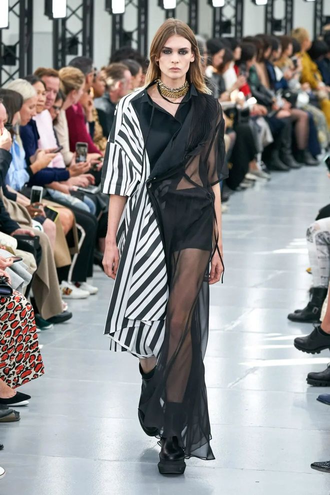 重构主义也出现在Sacai系列产品中-该品牌以结合不协调的功能,提供有趣的风格解决方案和新线条而闻名。因此,今夏,创意总监安倍千岁(Chitose Abe)展现了一件衬衫裁剪的裙装,由条纹面料和黑色欧根纱制成,并暗含百褶细节。Ports 1961还决定参与不等距物品的设计,并提出了结合各式各样织物,质地和印花的裙装。