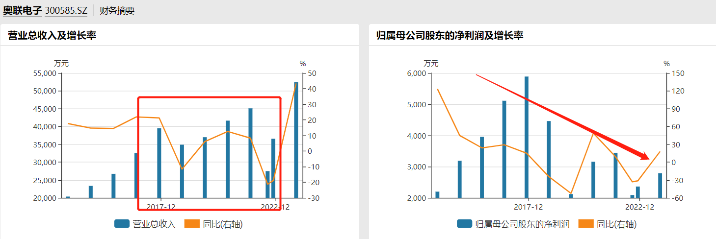 奥联电子原以电动汽车动力电子控制零配件为主要发展路径。虽然子公司产品在多个行业龙头应用领域拥有较强消费市场竞争力,客户众多并且具备一定名气,包括上海通用、上海通用、广汽、等传统整车厂,同时也已步入零跑、孙悟空、华为、蔚来、理想、广汽岚图等新能源电动汽车分销商体系。不过依照WIND数据显示,奥联电子销售收入自2017年起就步入了一个长期困局,净利润更是急遽下滑。