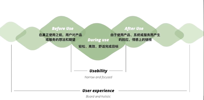 易用性Usability考量的是某一采用者,某一情景下顺利完成具体内容最终目标过程的机能科学性、工作效率和令人满意某种程度。采用者新体验User experience考量的是采用者与商品,服务项目,自然环境或公共设施交互时的新体验和直觉体会。采用者新体验横跨商品的的采用其间,而易用性更特别针对商品的采用期。
