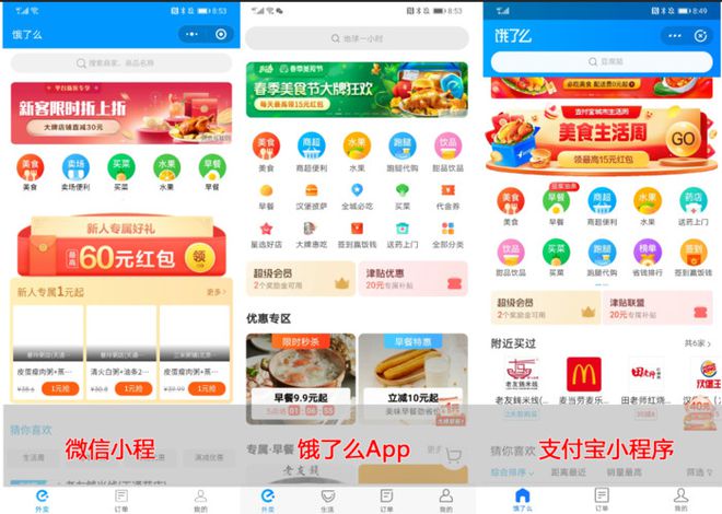 ↑比如饿了么外卖,其App底部导航栏有四个选项,而小流程只有三个