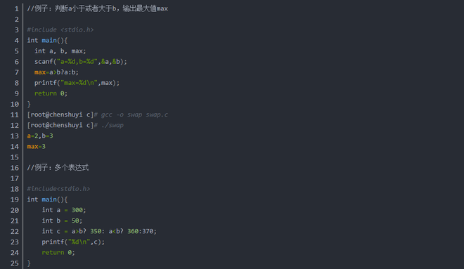 三目演算符:条件 ? 结果1 : 结果2(条件成立时,返回:号前的结果;不成立就返回后面的结果)注:条件操作符优先级高于表达式、逗号操作符,低于其他操作符。