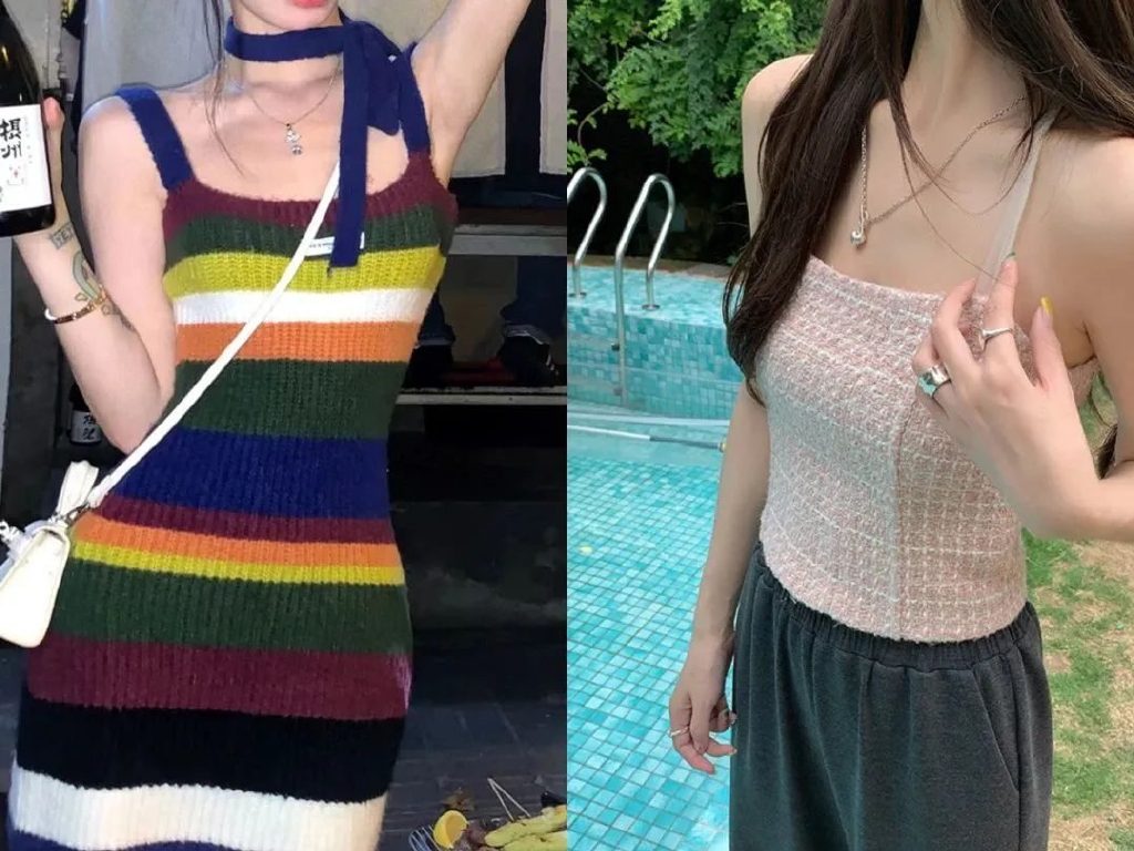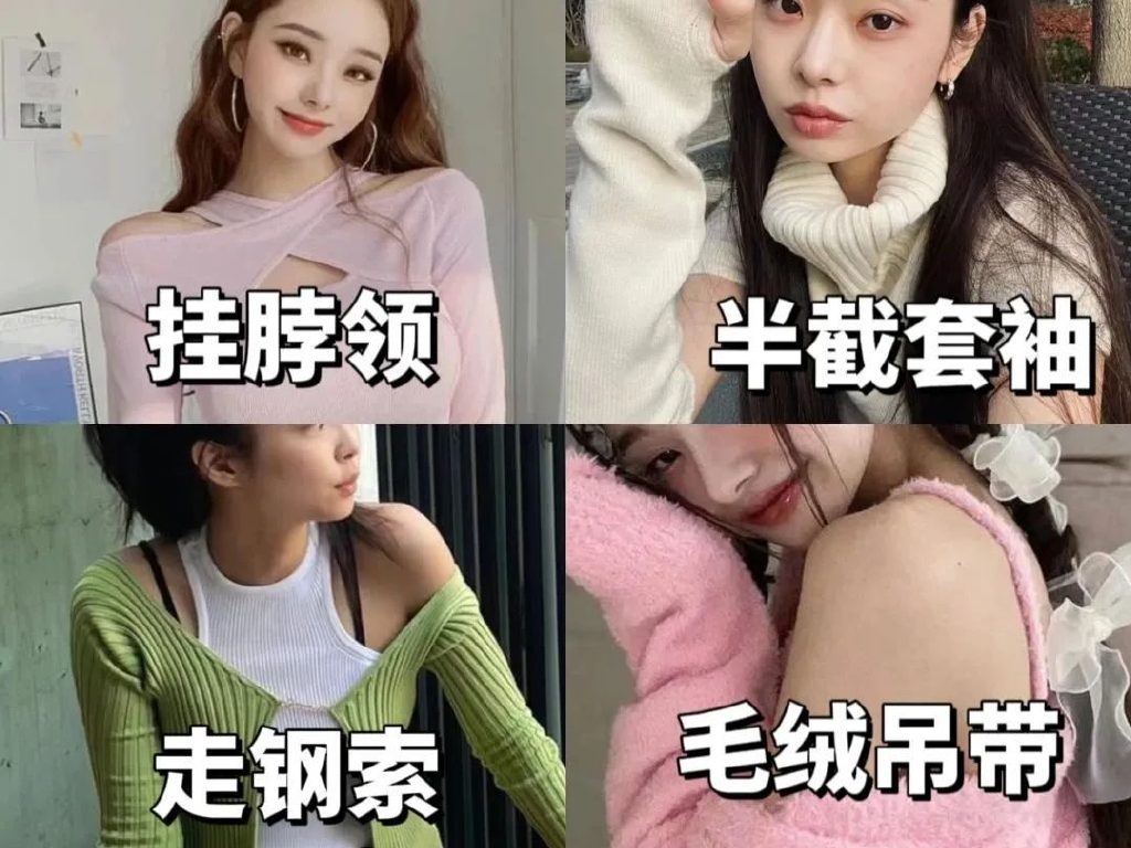 📌常见元素:半截套袖、一字肩、挂脖领、毛绒吊带都是去年大火的火辣单品。
