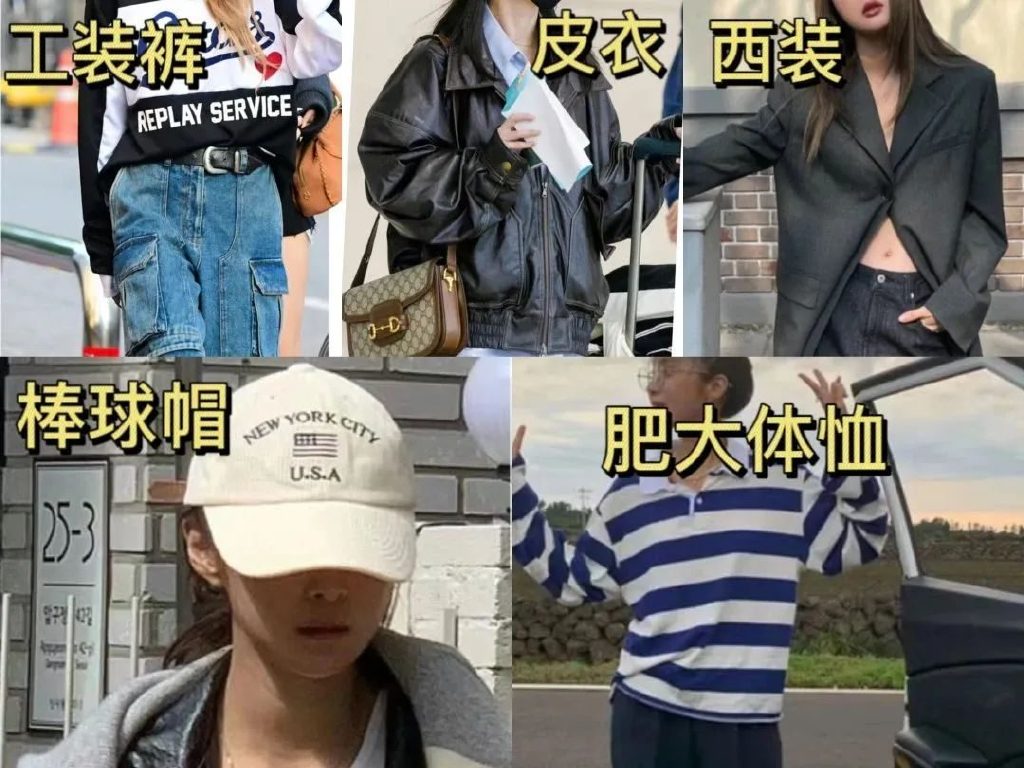 📌常见的元素:工装裤、皮革、西装、棒球帽、大体恤都是常见元素。