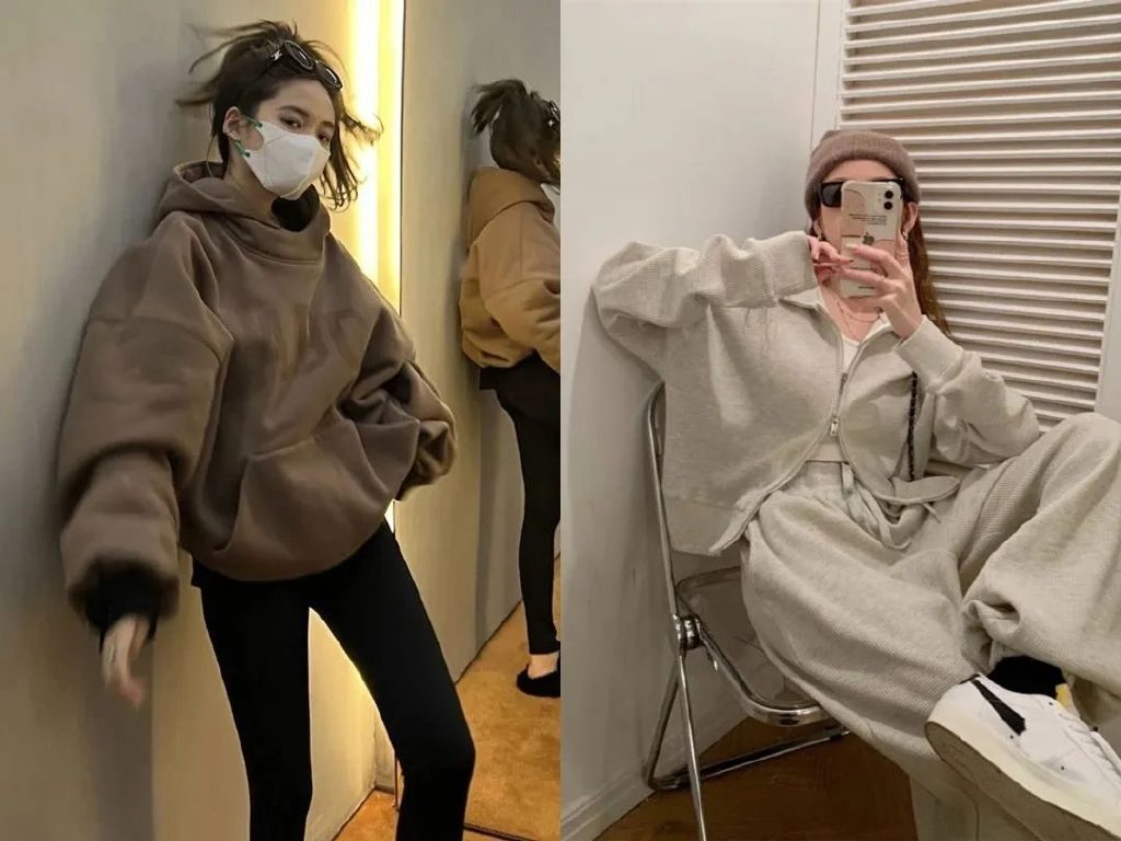 再比如说肥大卫衣帅气十足,那就搭配leggings或者丝袜展示美好曲线。