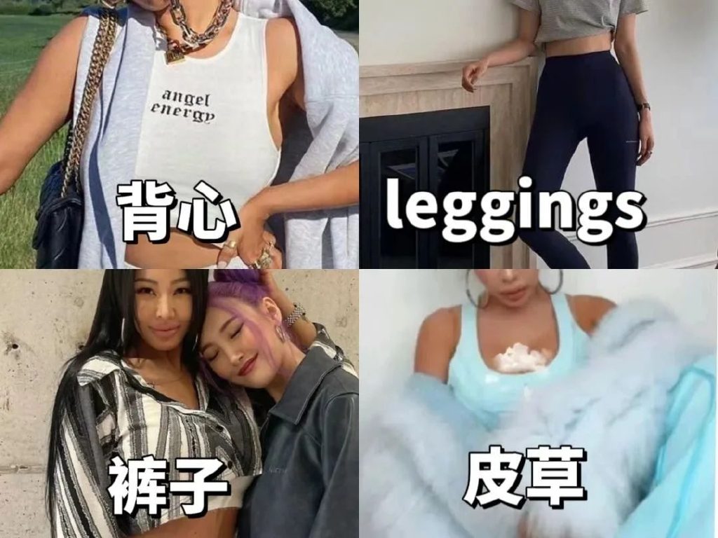 📌常见的元素:紧身小背心、工装裤、leggings、皮草、卫衣、印花。