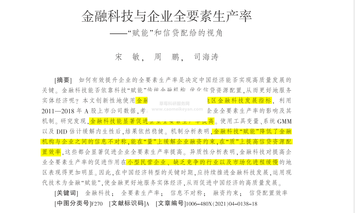 参考历史文献 高映,周鹏,司海涛.金融技术创新信息技术与民营企业全基本要素劳动生产率——“借力”和信贷口粮的视点[J].中国工业经济,2021,No.397(04):138-155.