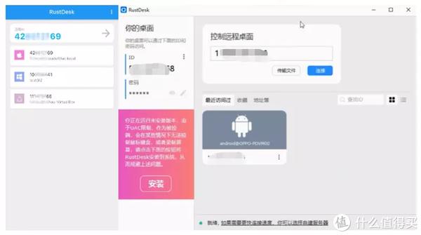 采用方式是输入被控电子设备的ID及密码就能连接,可用机能比较此基础,远不如ToDesk、TV和向日葵的多。远控中的稳定性及速度中规中矩,流畅性时好时坏,想获得更加舒服的体验需要自建中继服务器,且前提是在国内已有服务器,阿宝及轻度用户搞不来也没必要这么做。
